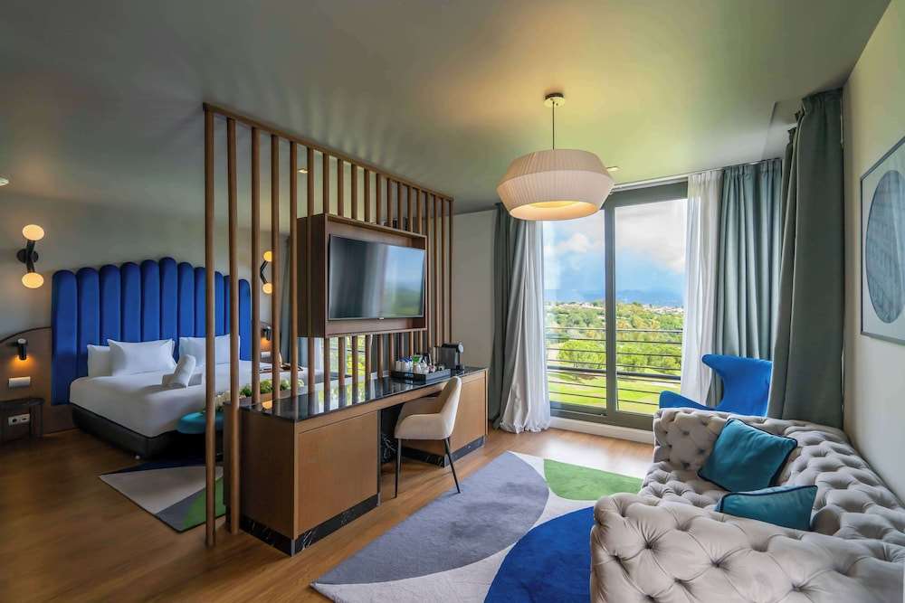 Die Anlage bietet rund 150 modern und stilvoll eingerichtete Zimmer und Suiten mit hellen Räumen, Golf- oder Poolblick sowie komfortabler Ausstattung wie Klimaanlage, WLAN, Minibar und hochwertigen Badezimmern.