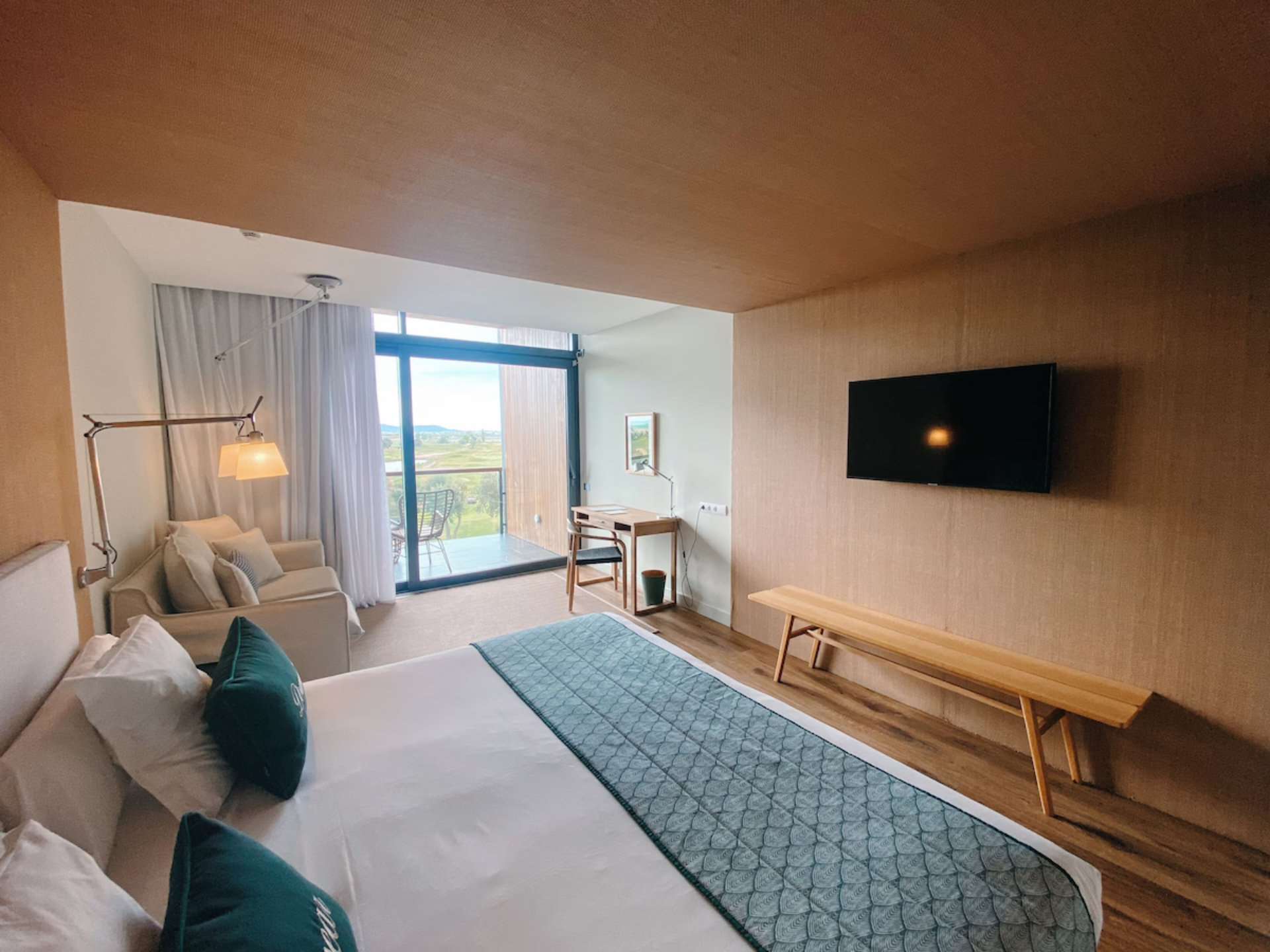 Das moderne Hotel überzeugt mit klarer Architektur und eleganter Ausstattung. Die großzügigen Zimmer bieten Ausblick auf die Golfplätze oder die umliegende Landschaft.